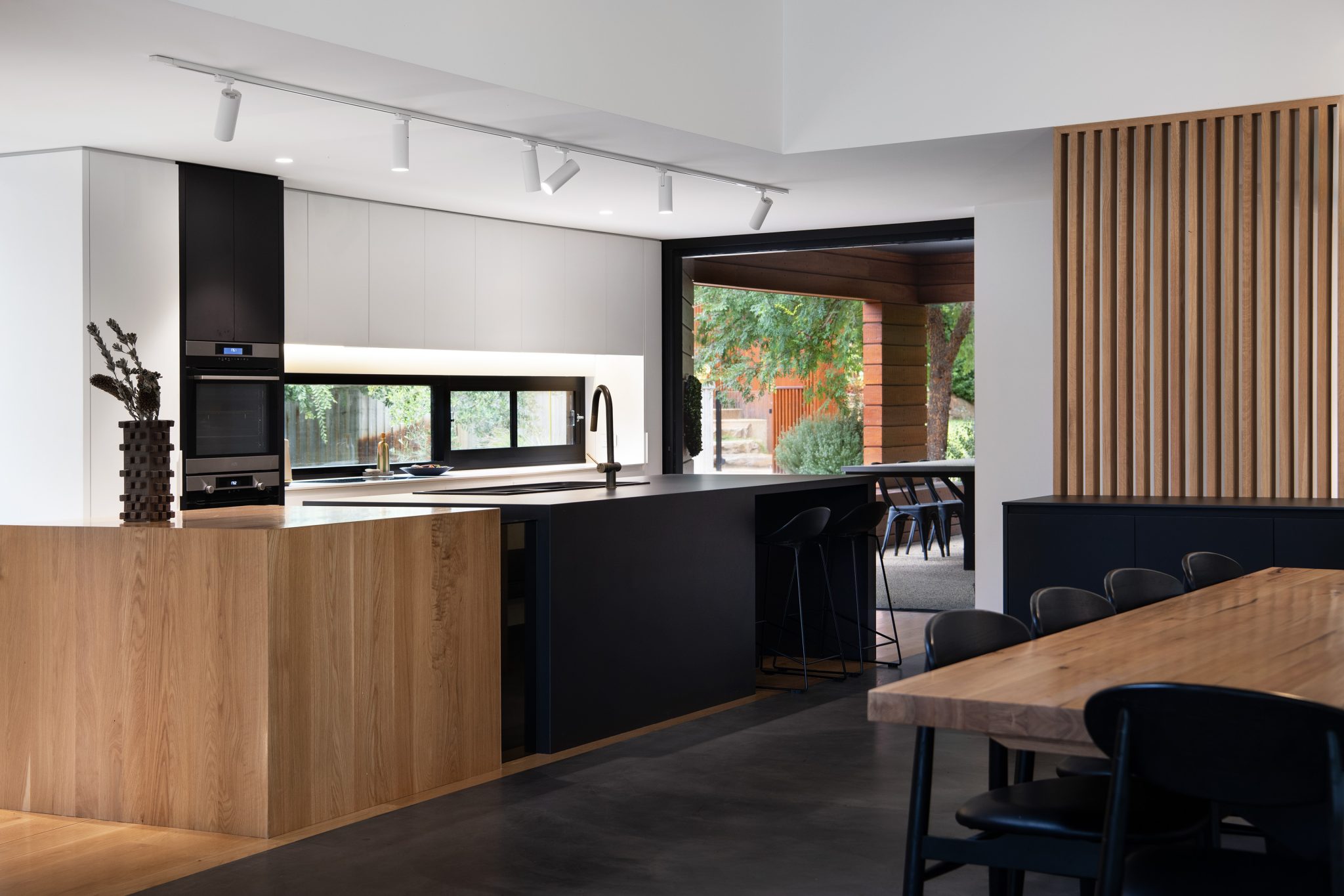 The kitchen lends itself to entertaining with sleekly integrated AEG appliances. The Neolith manufactured stone benchtop connects to a custom American oak island bench, providing ample space for large gatherings. Slide back the Centor retractable flyscreens and stacking doors and people can flow through to the outdoor entertaining area, complete with built in BBQ, fridge and bench seating.