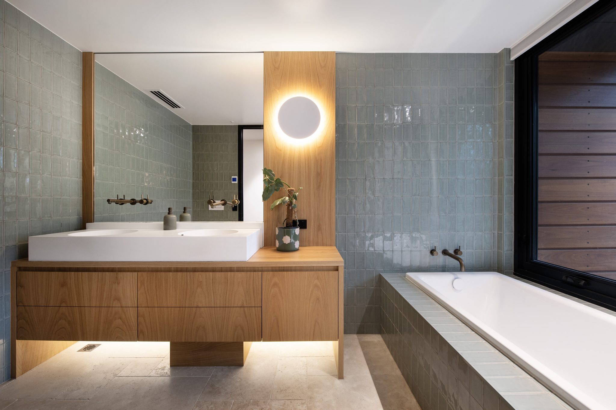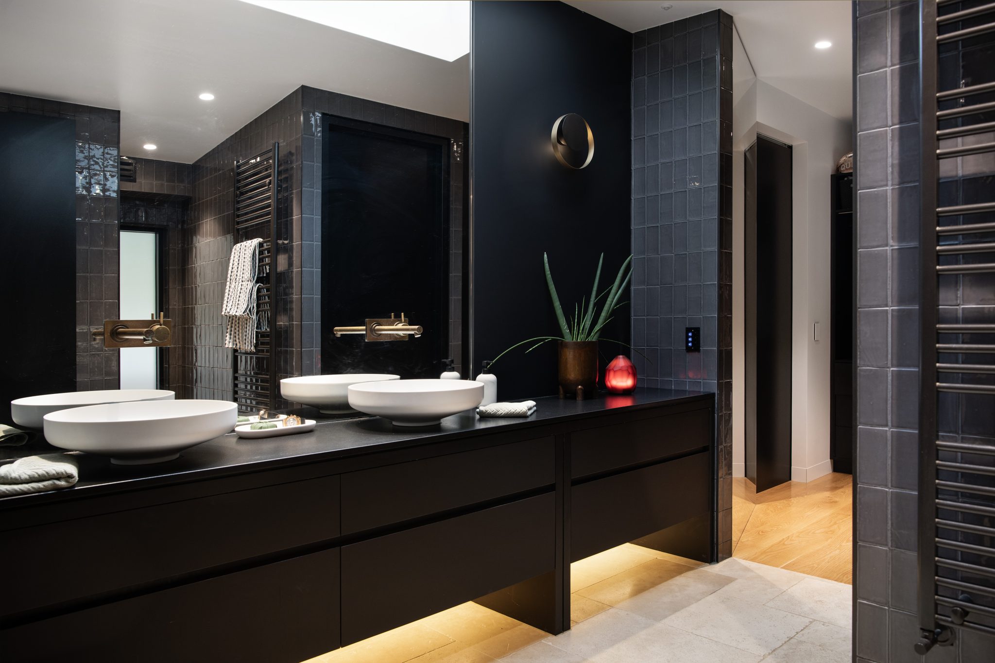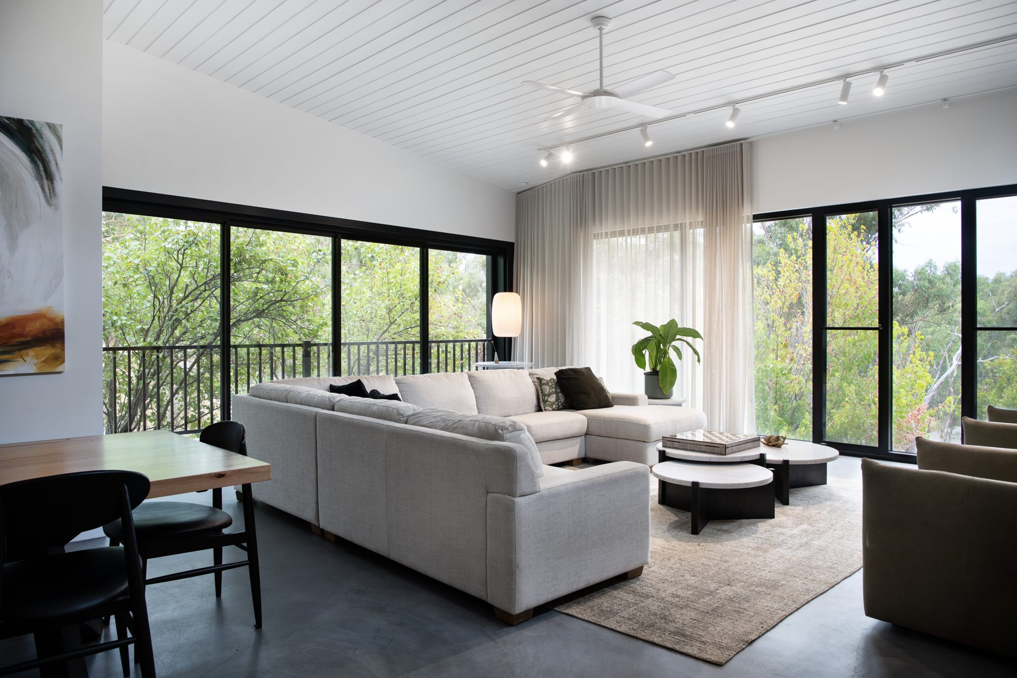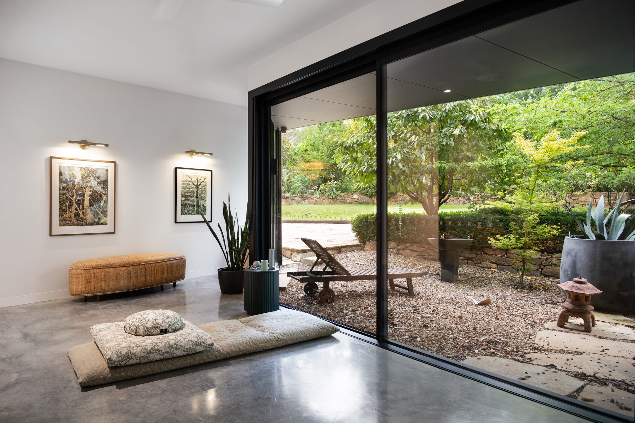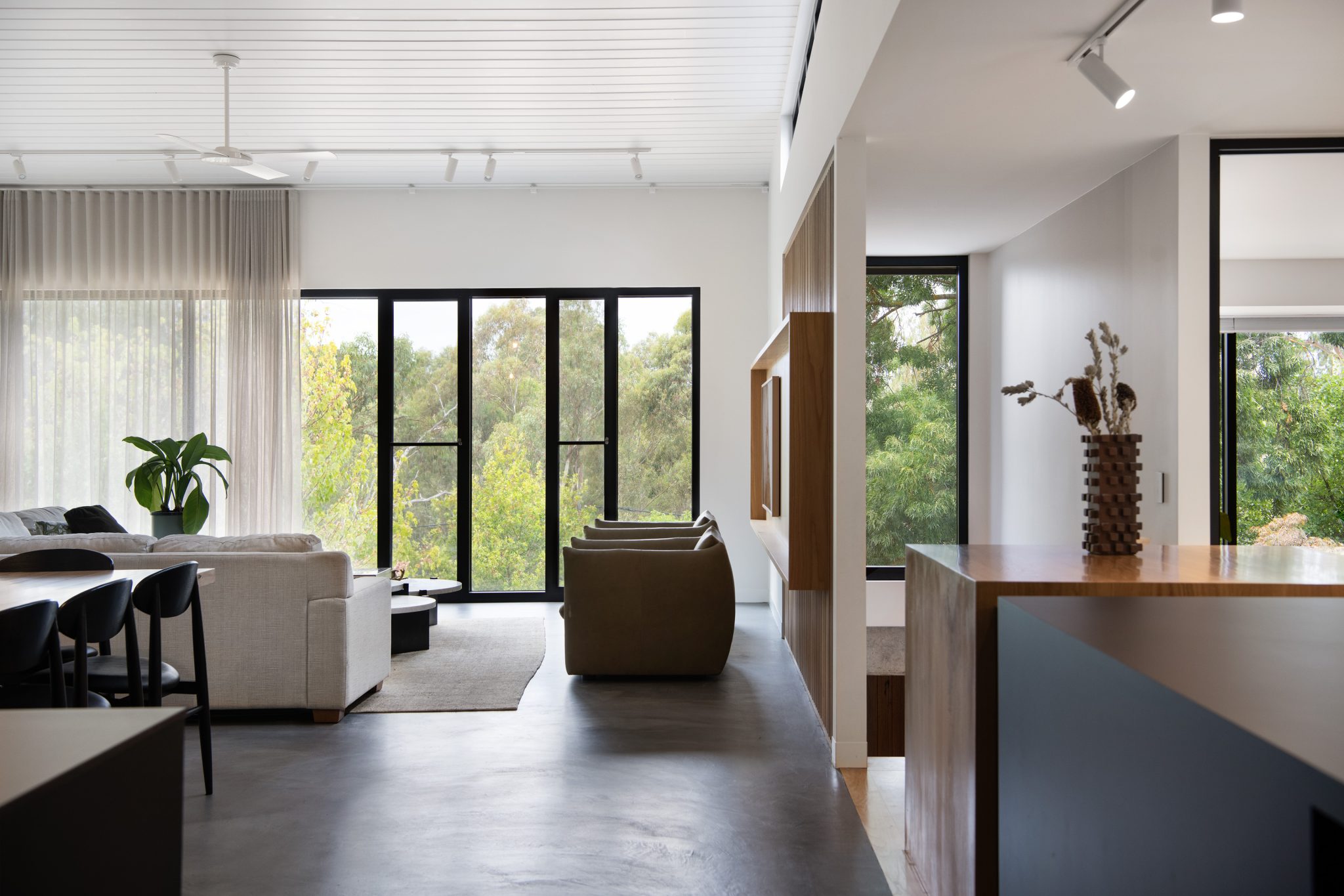 Floor to ceiling thermally broken double-glazed windows frame the main living area with its burnished concrete slab. The use of 2400mm doorways and the absence of architraves and skirting boards throughout means that nothing unnecessary distracts the eye, it also adds to the overall sense of generosity and space.