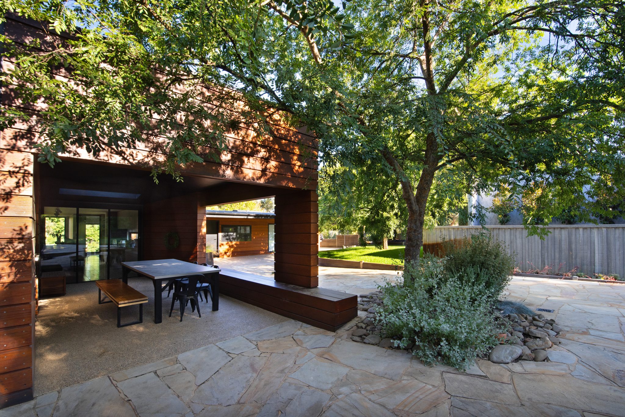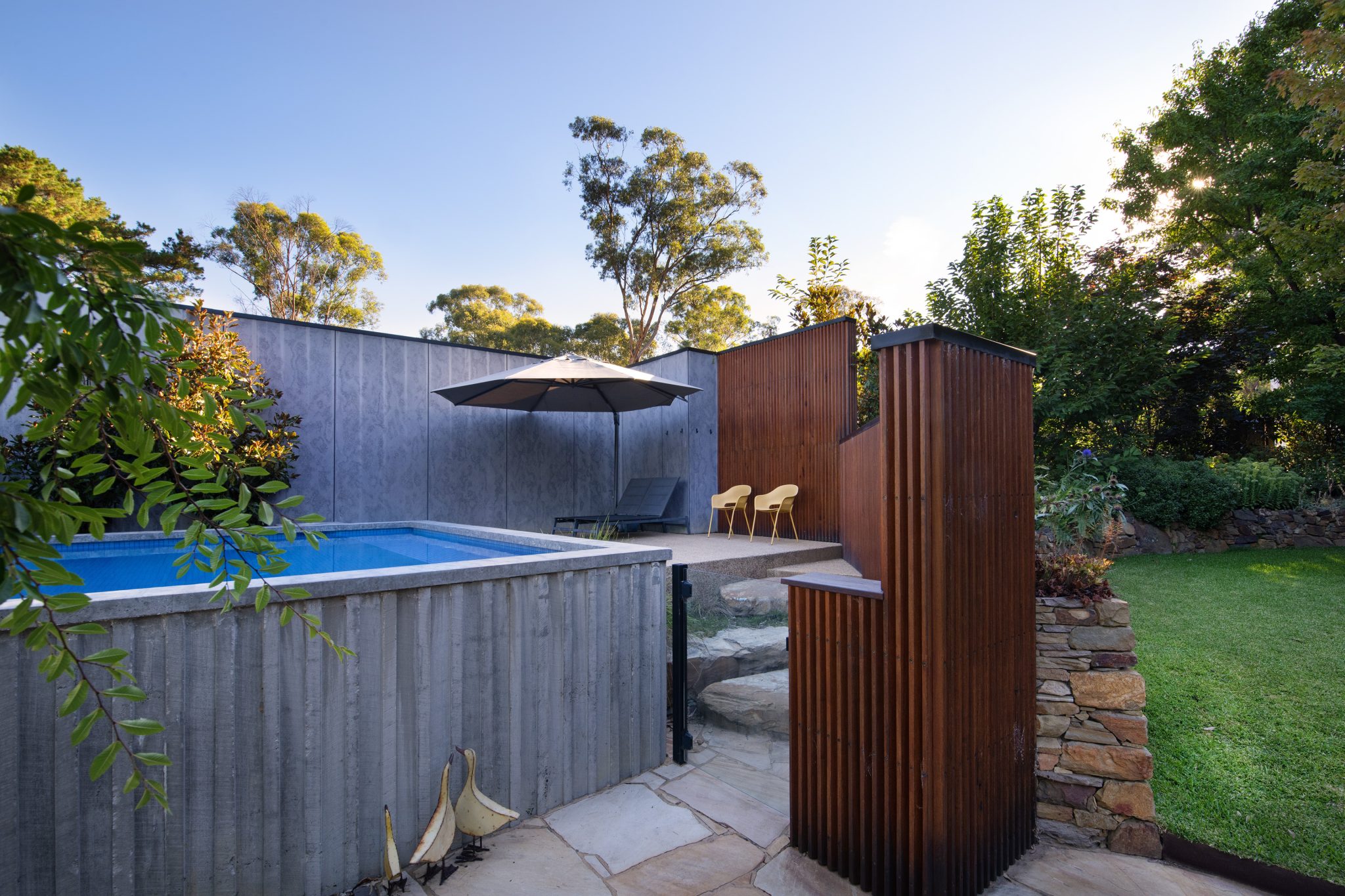 Also included in the build is a freestanding concrete pool, rising up from ground level to become a striking garden feature surrounded by handcrafted, custom moulding. The Remco Coverstar fully automated pool cover can hold the weight of adult and has inbuilt thermal properties. An exposed aggregate concrete pool deck perched at pool level provides the perfect vantage point to supervise younger swimmers or just relax after a dip. Cemintel Barestone™ External prefinished panels provide a raw, contemporary finish and will weather naturally. Large slabs of local stone add texture. Custom banquette seating built into the patio wall provides another spot to watch the pool.