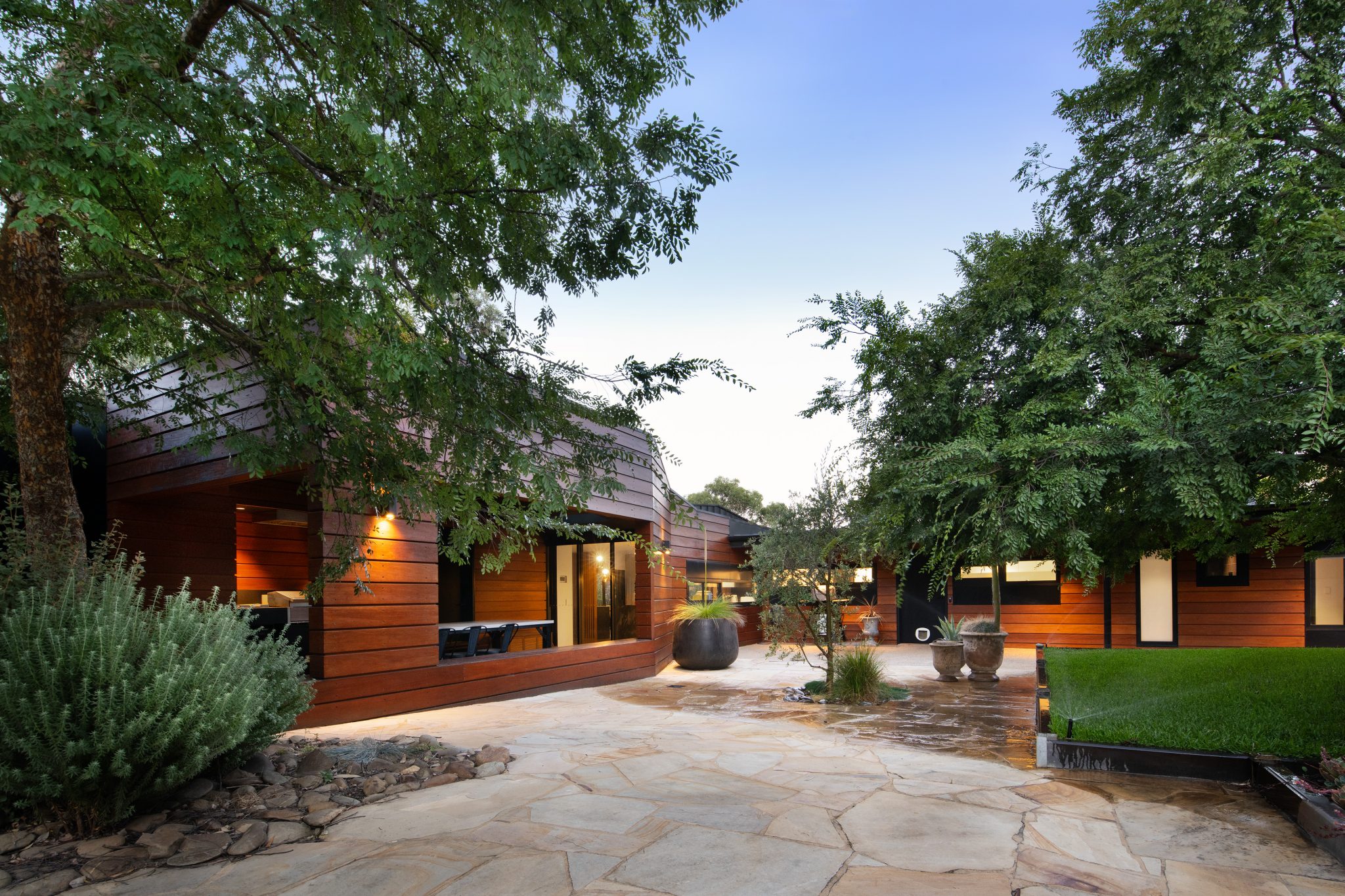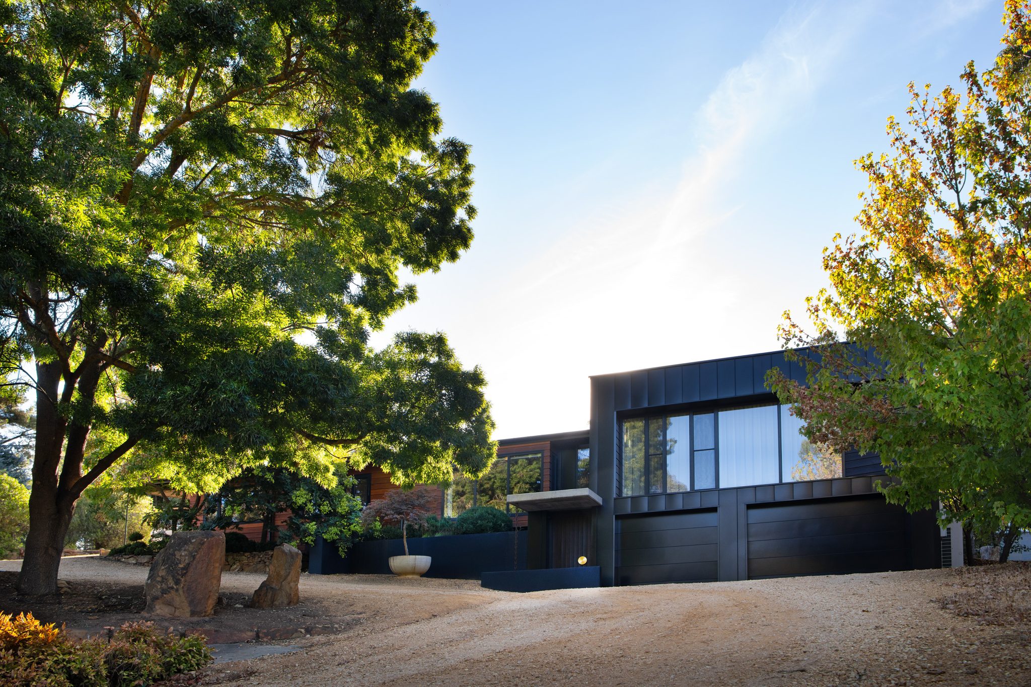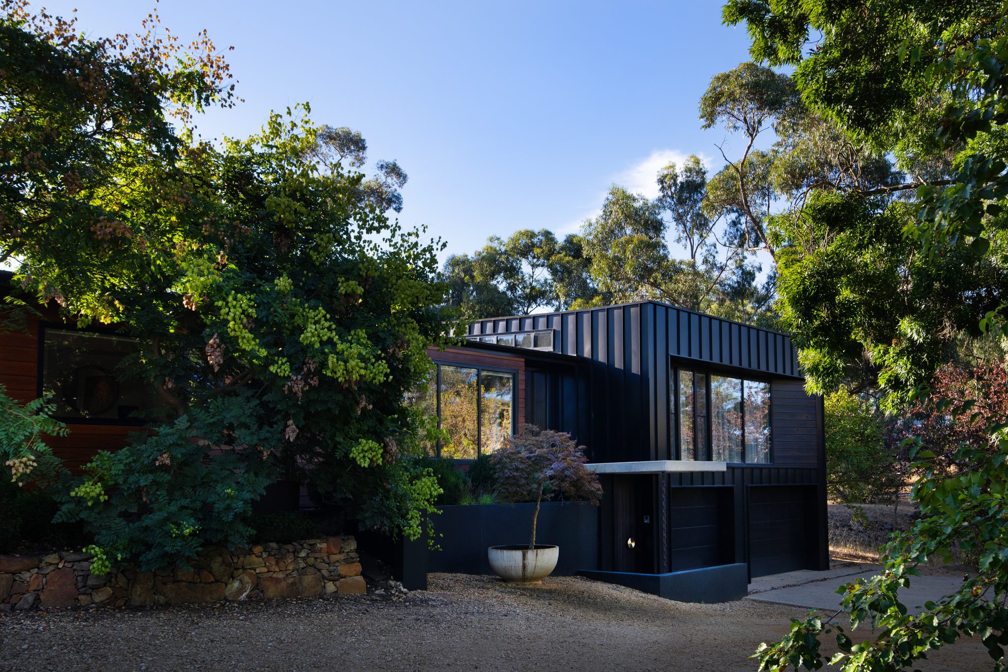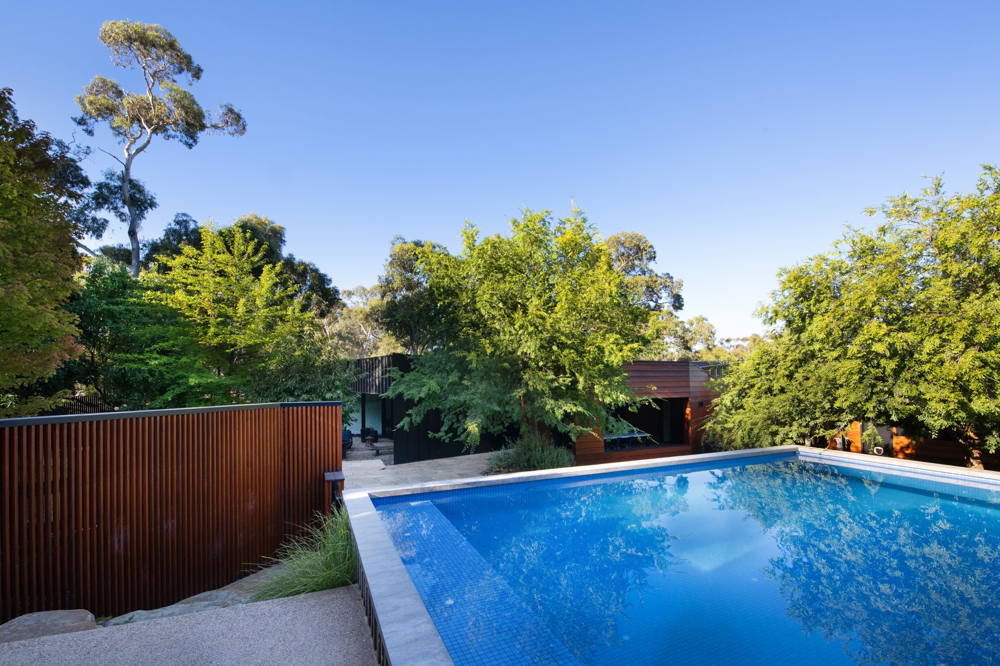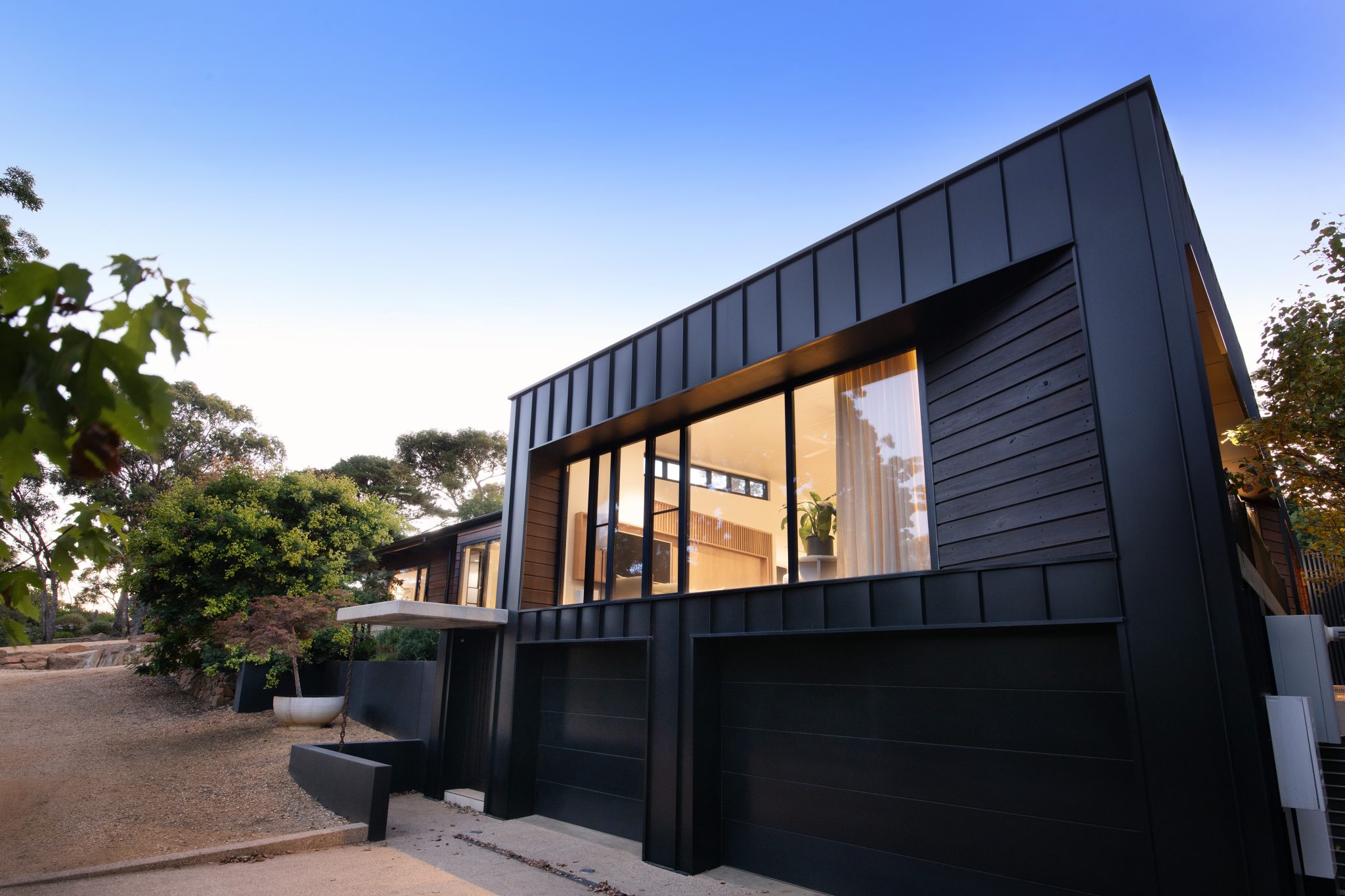 Soaring vertical panels of black Lysaght Enseam® architectural cladding are a standout feature of the exterior. The panels intersect with custom-milled blackbutt timber cladding creating a contrast of textures and colours to meld with the bush environment. The timber cladding sits under the roofline to protect it from the weather and reduce upkeep.
